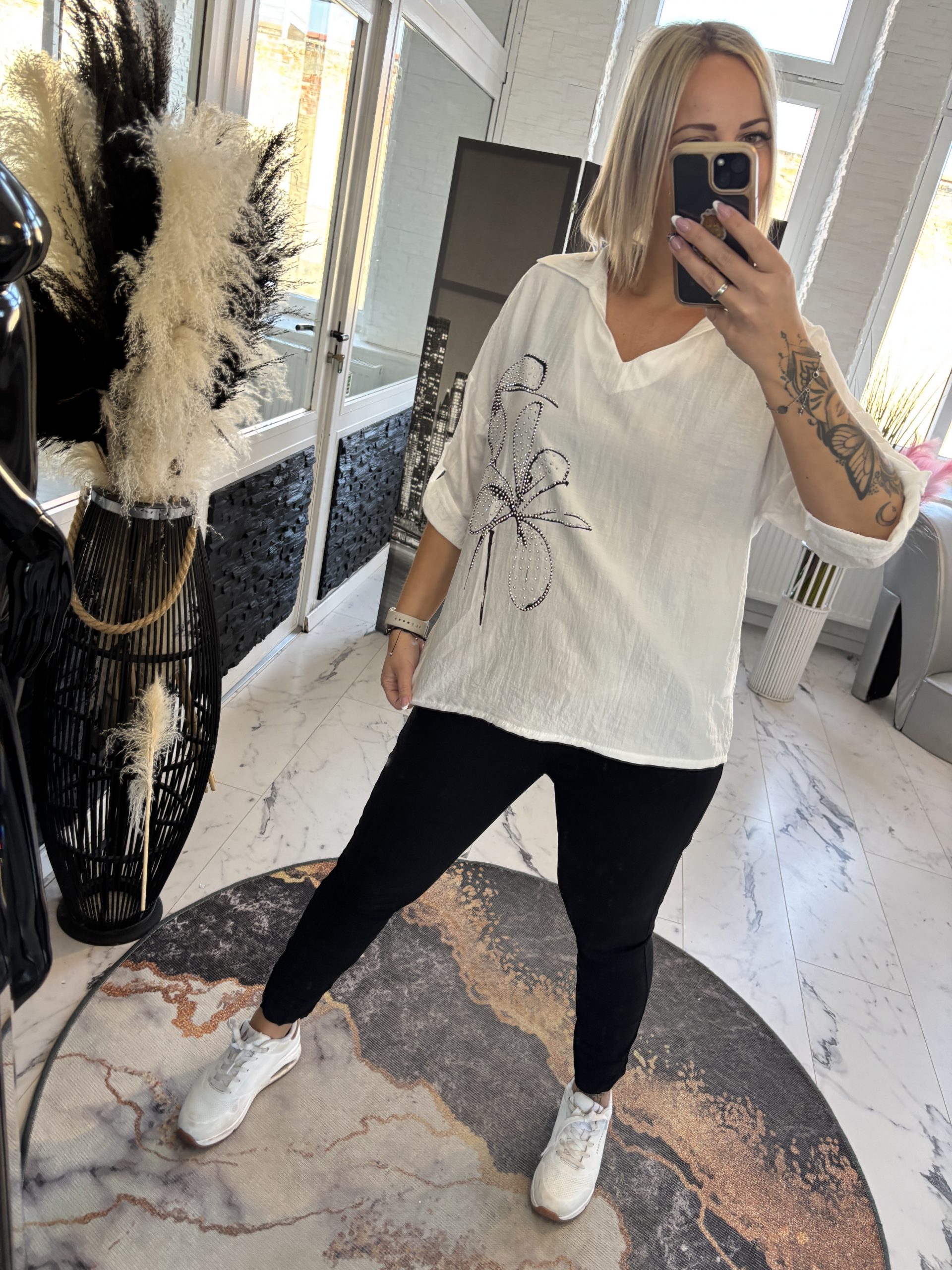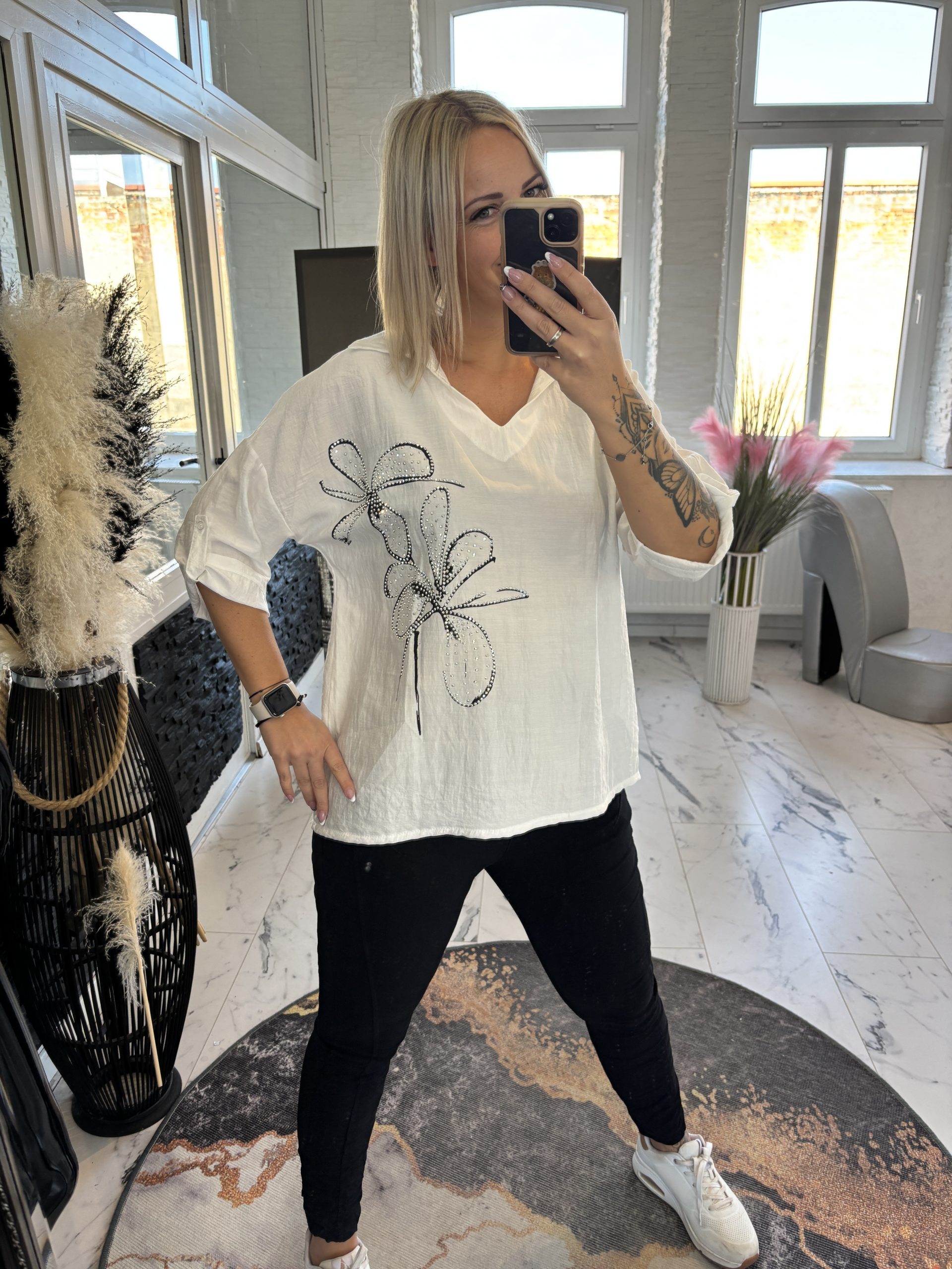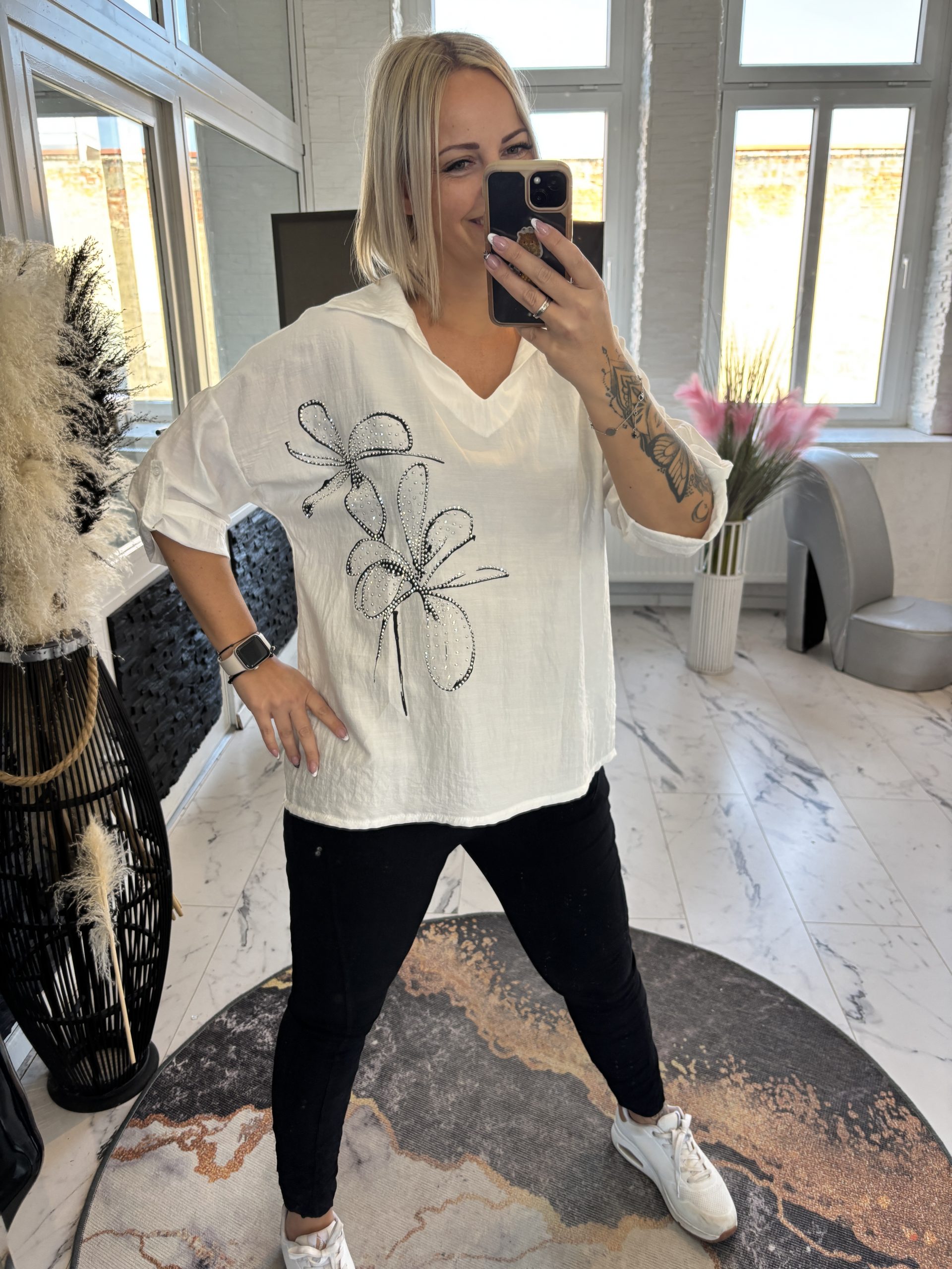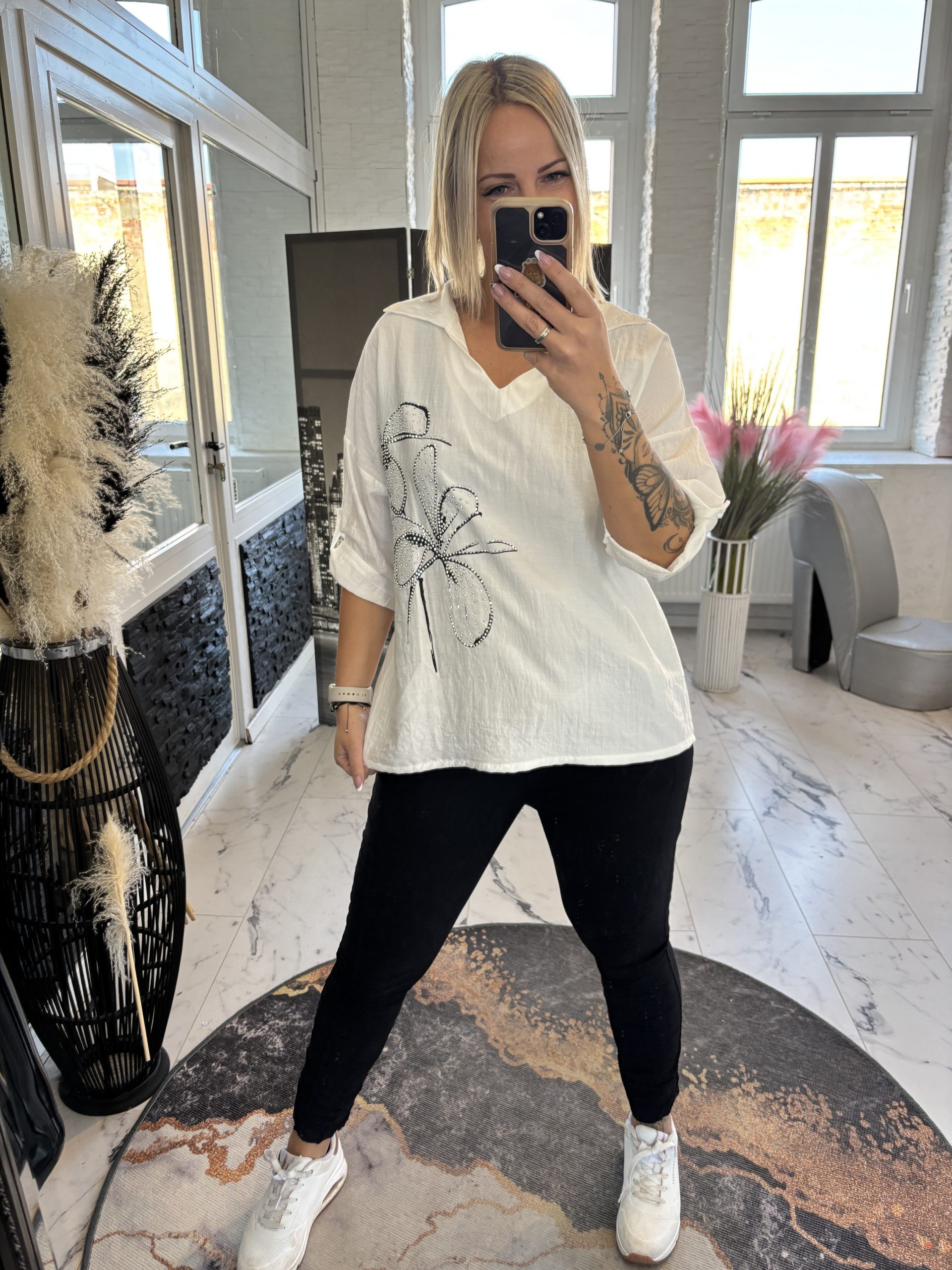 Blusenshirt mit Stehkragen und Glitzer Lilie