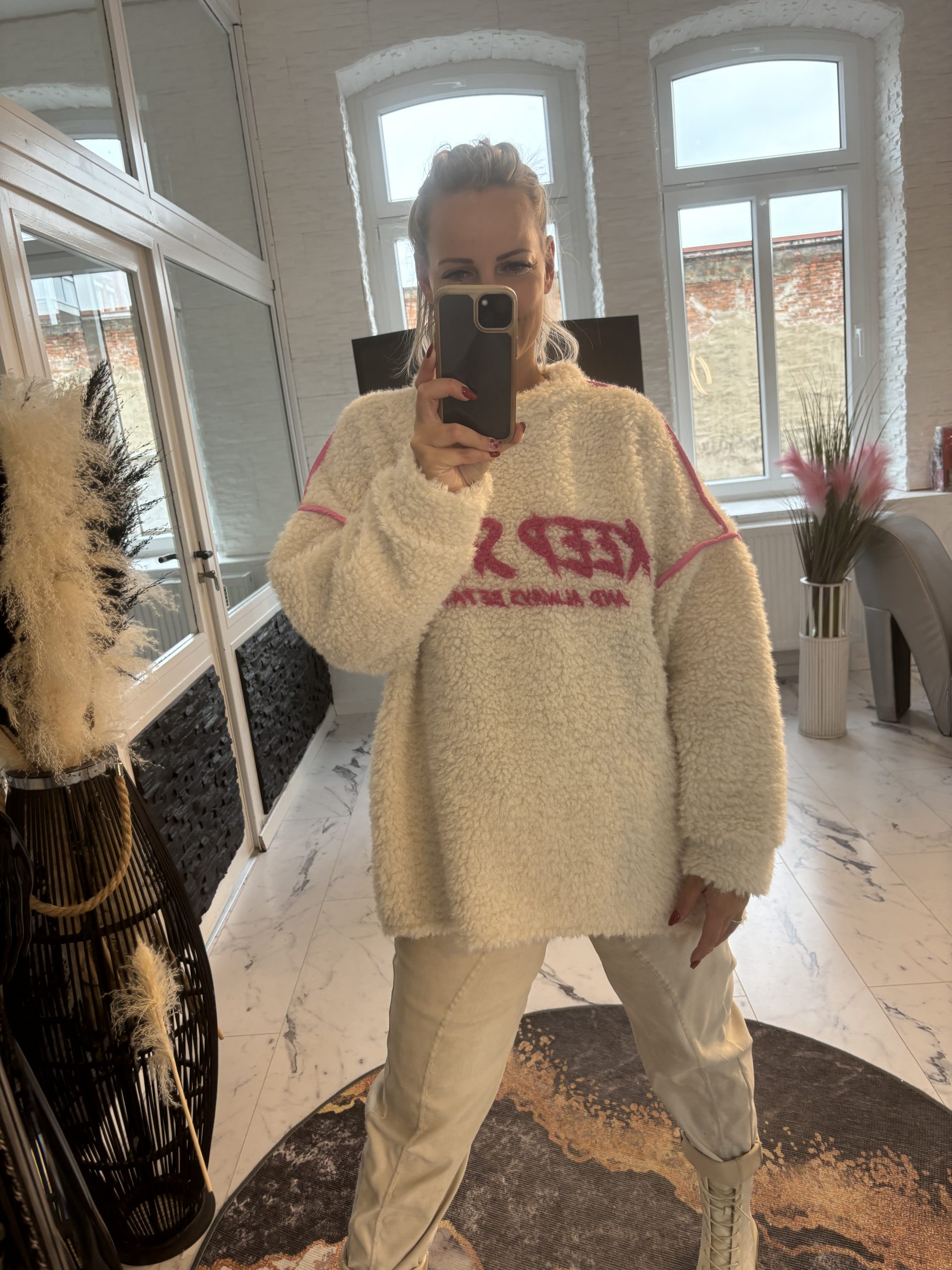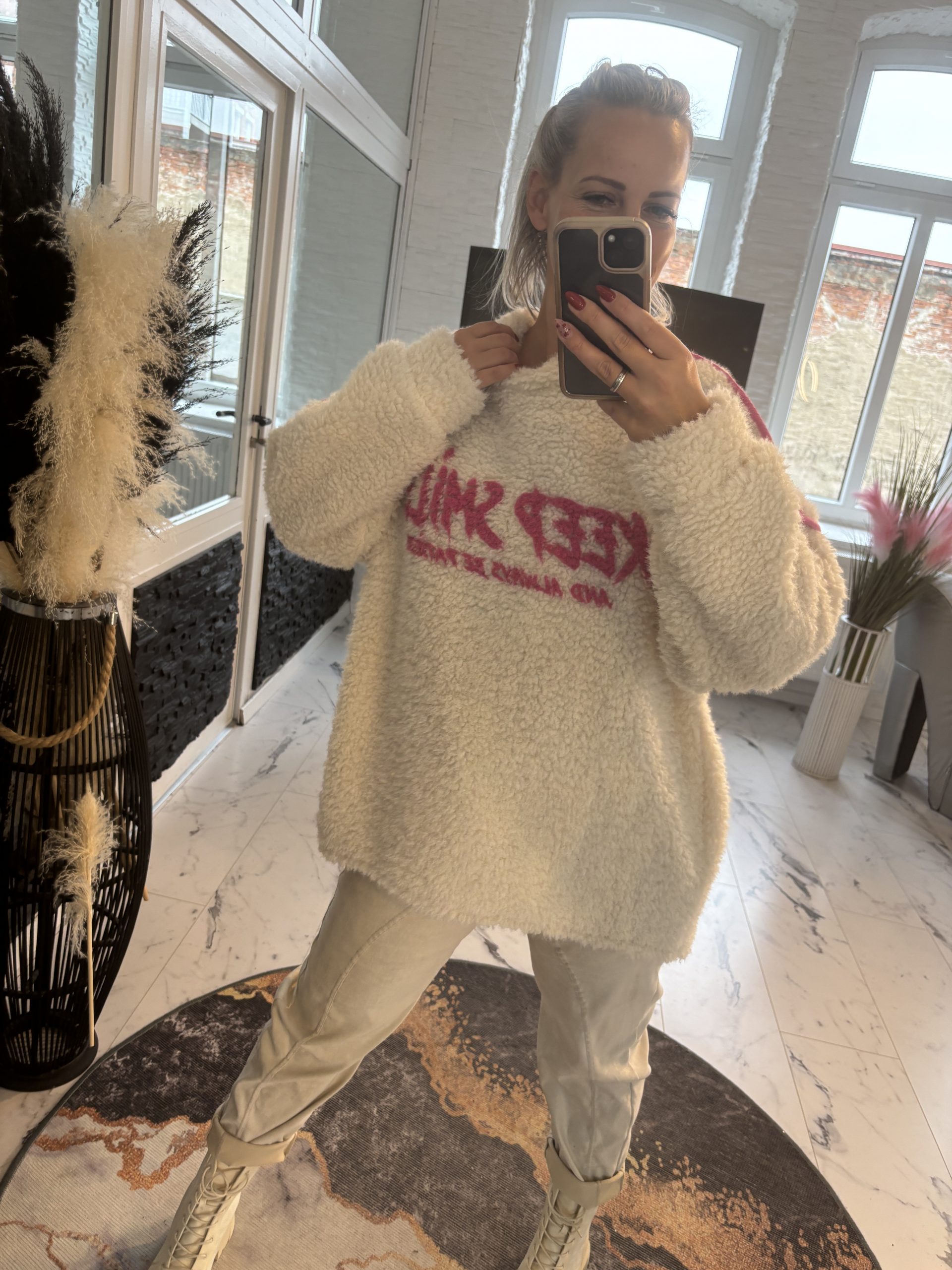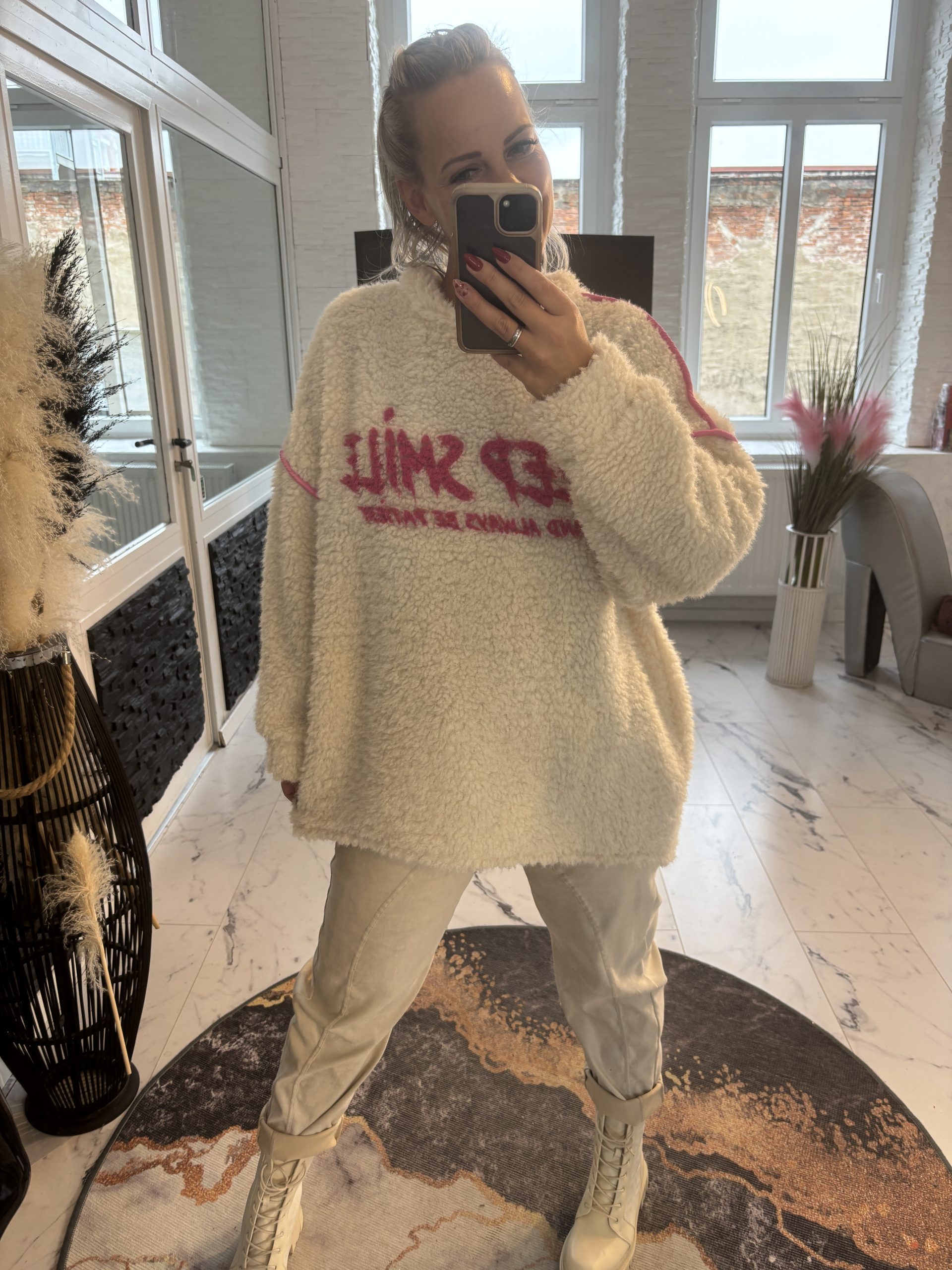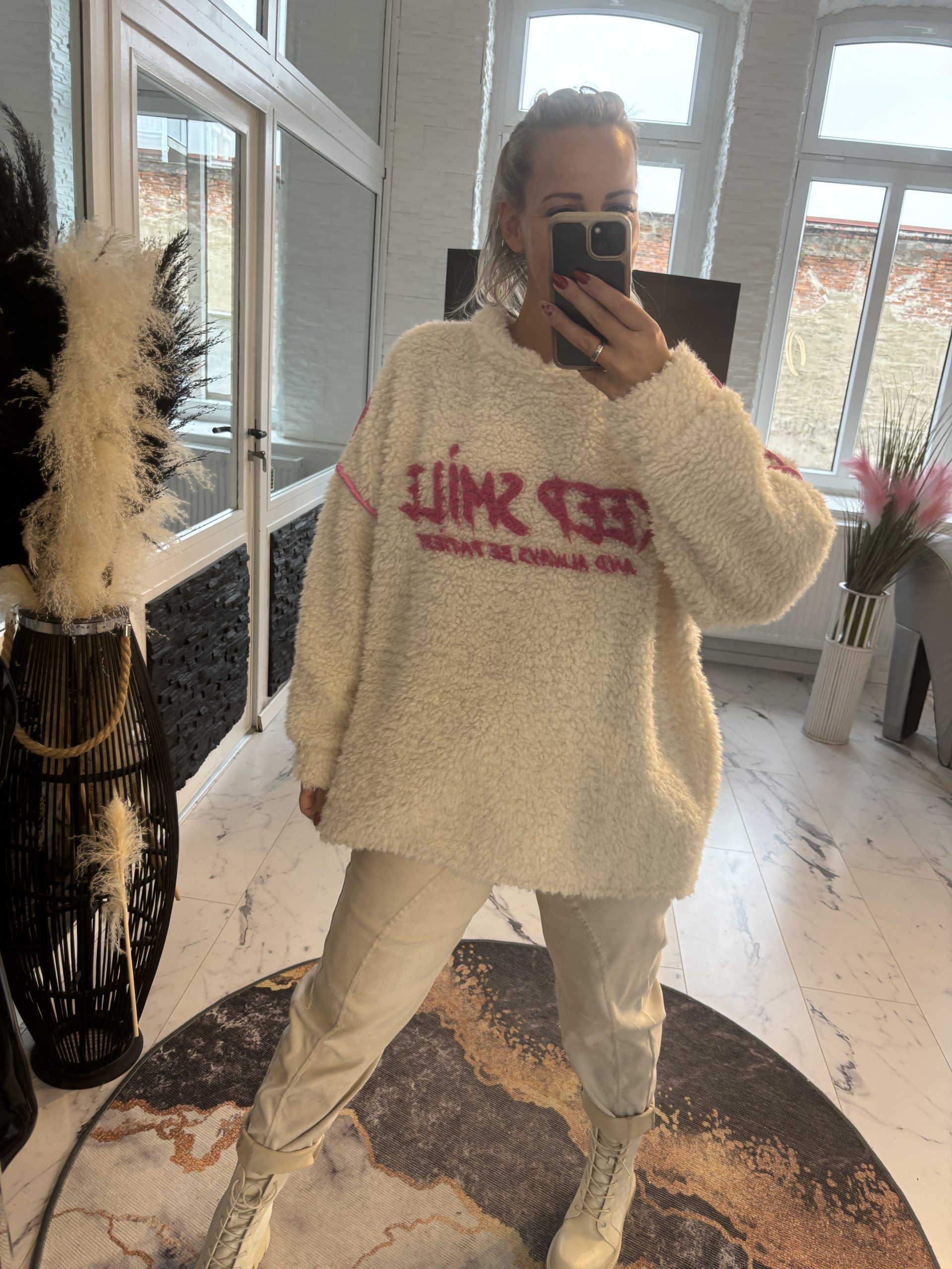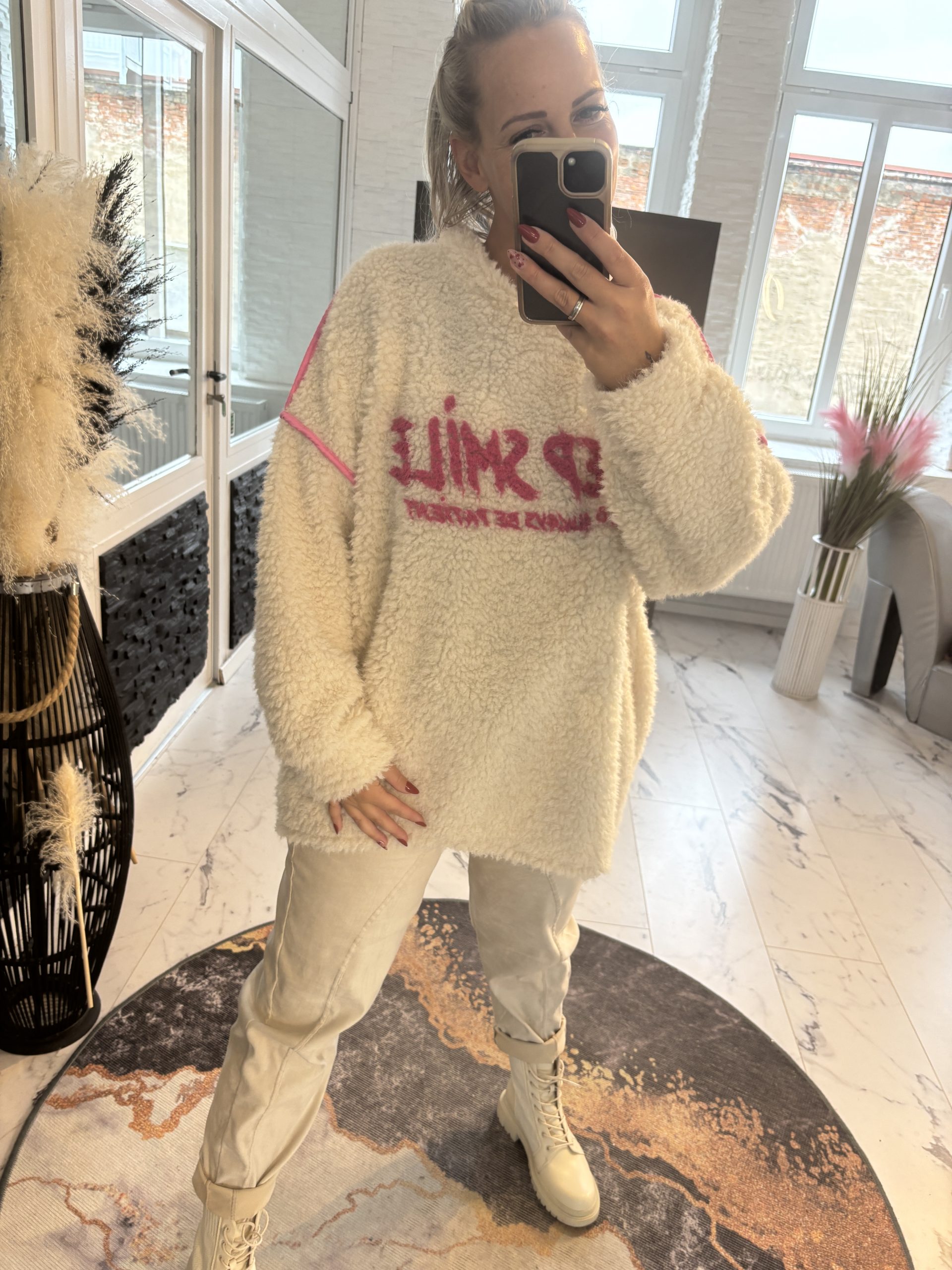 Bouclé Longpulli mit Pinker Schrift und aufgesetzten Nähten an den Armen..