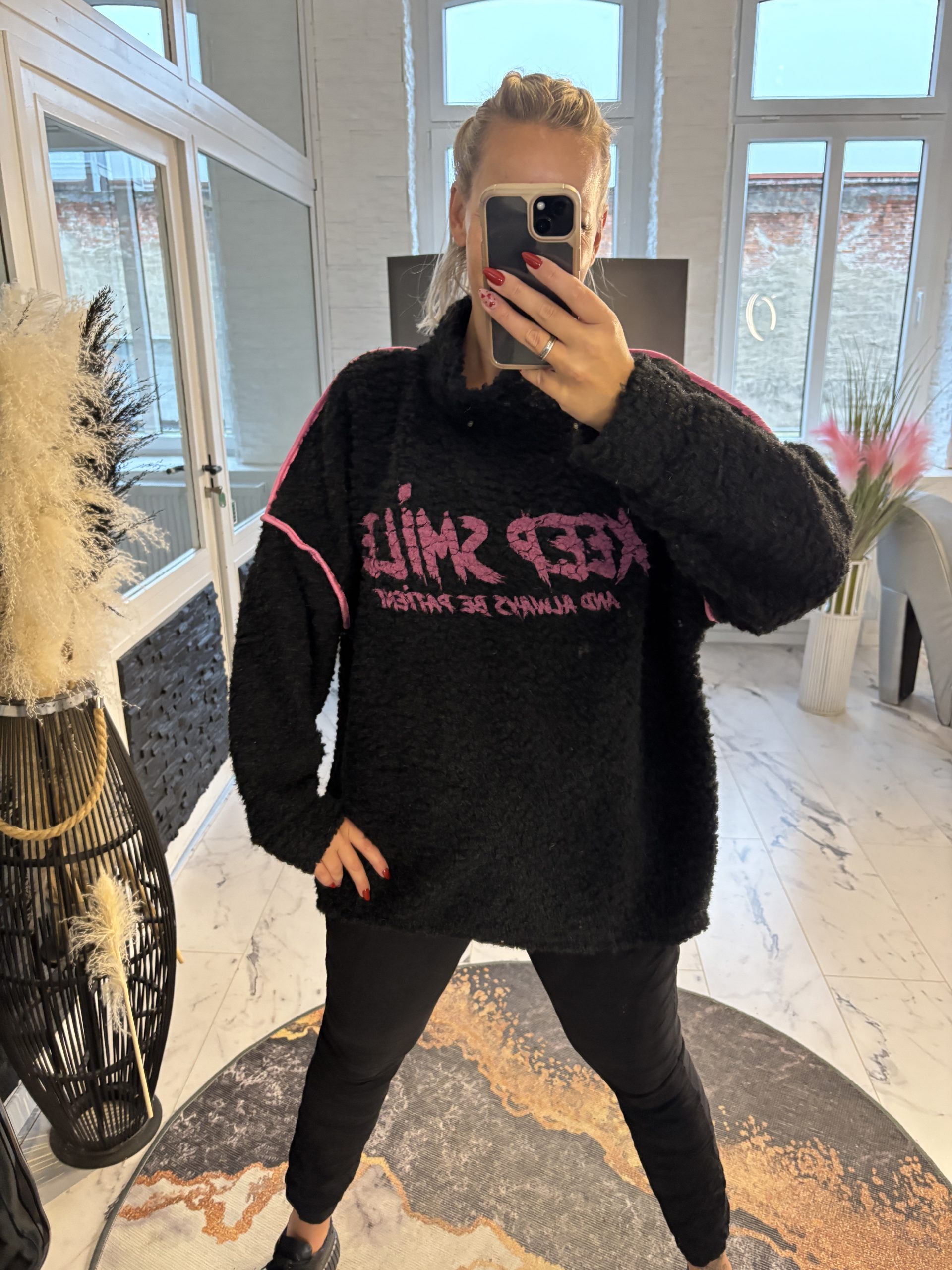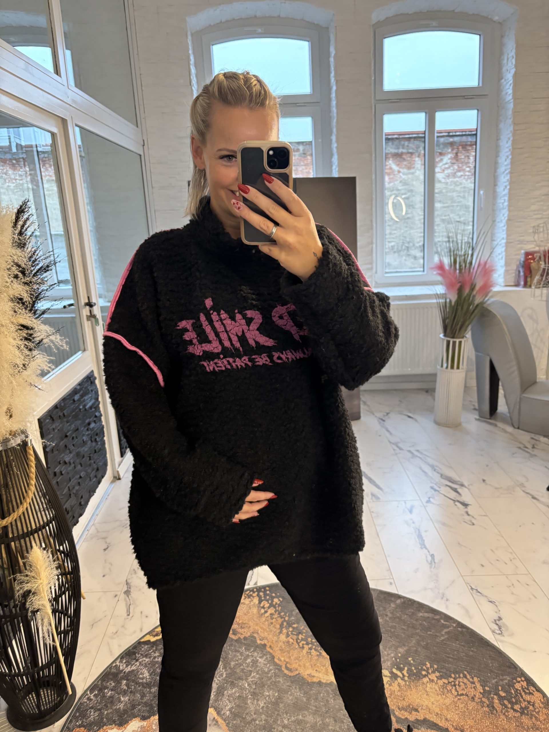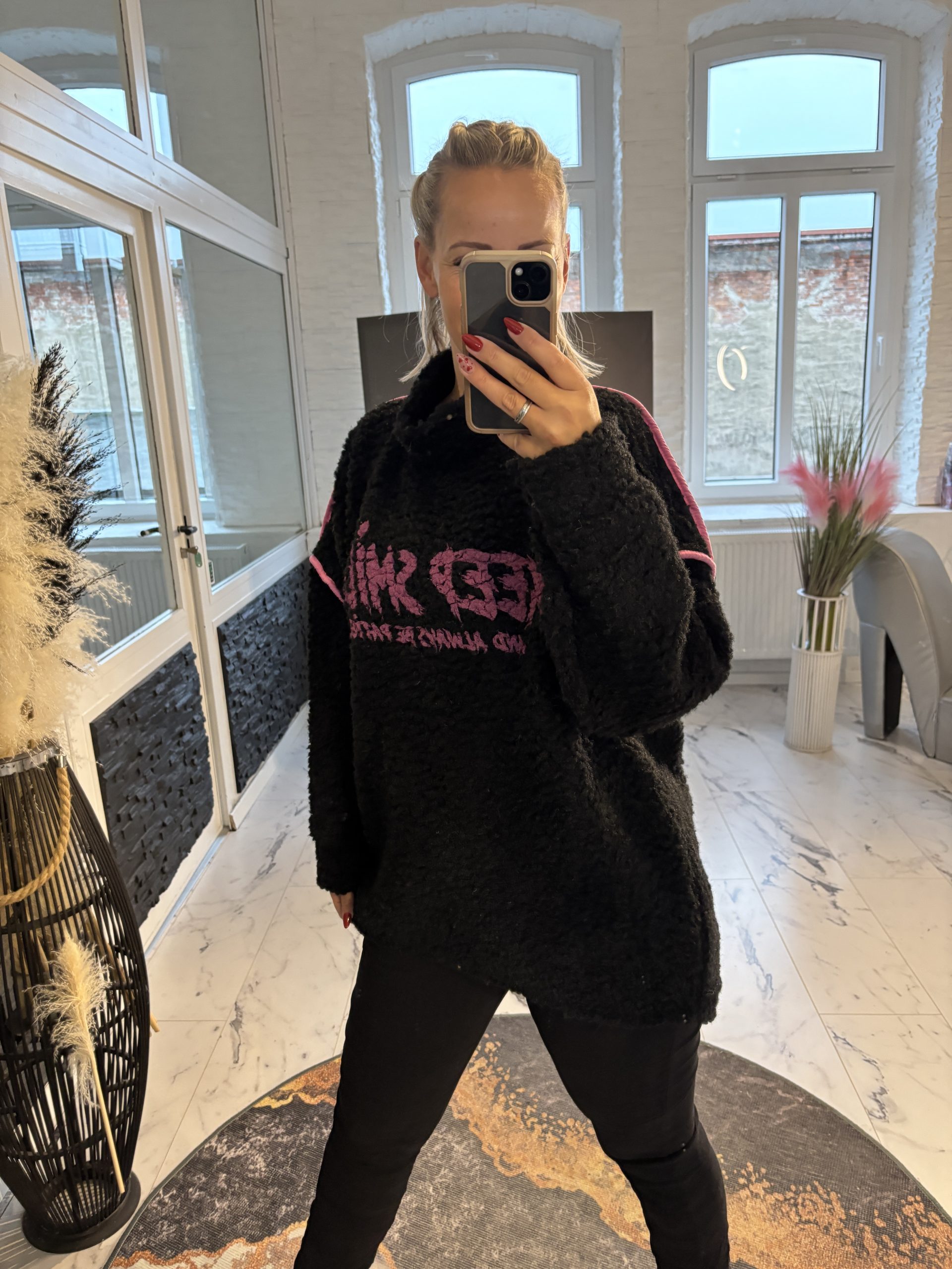 Bouclé Longpulli mit Pinker Schrift und aufgesetzten Nähten an den Armen..