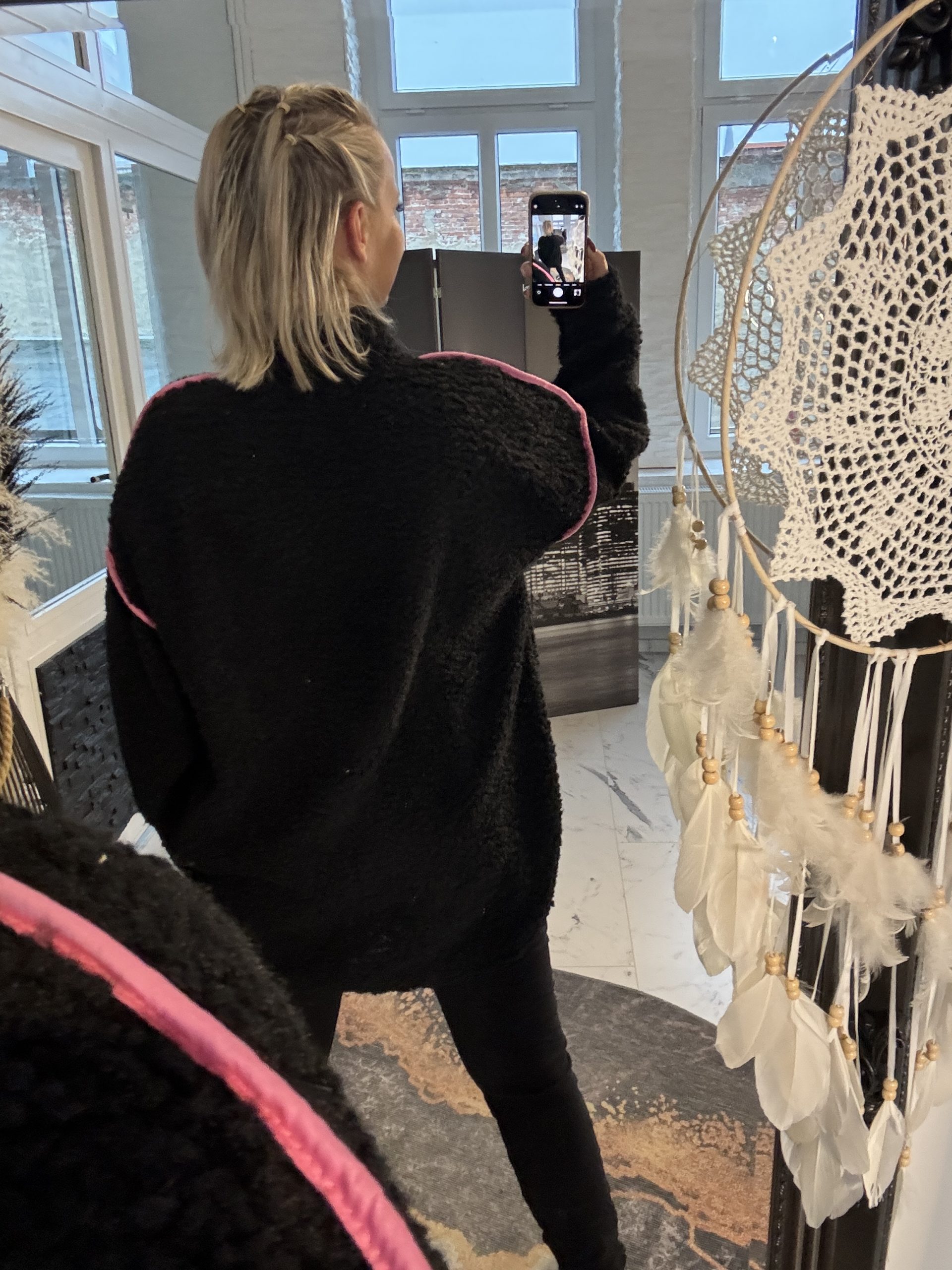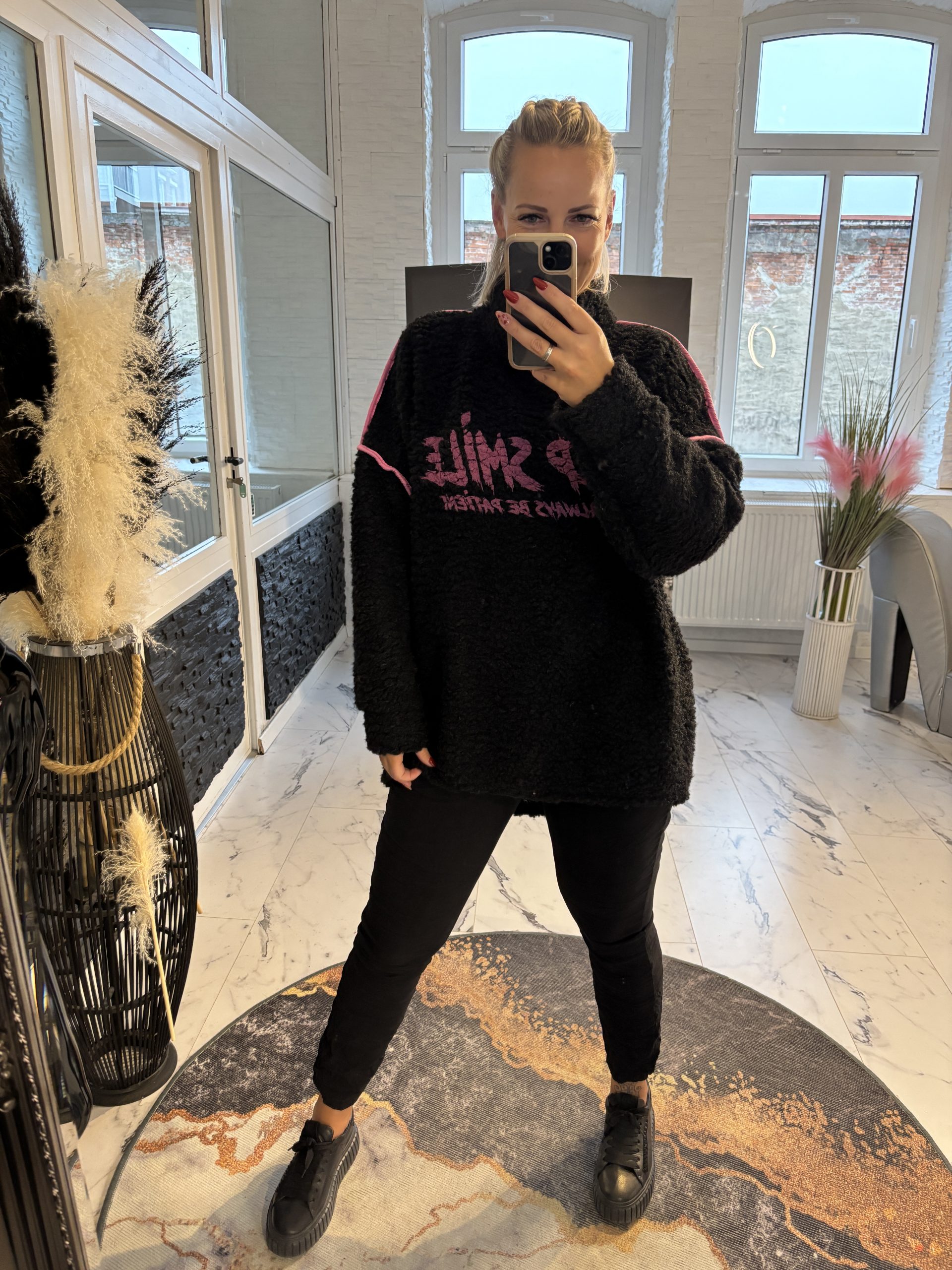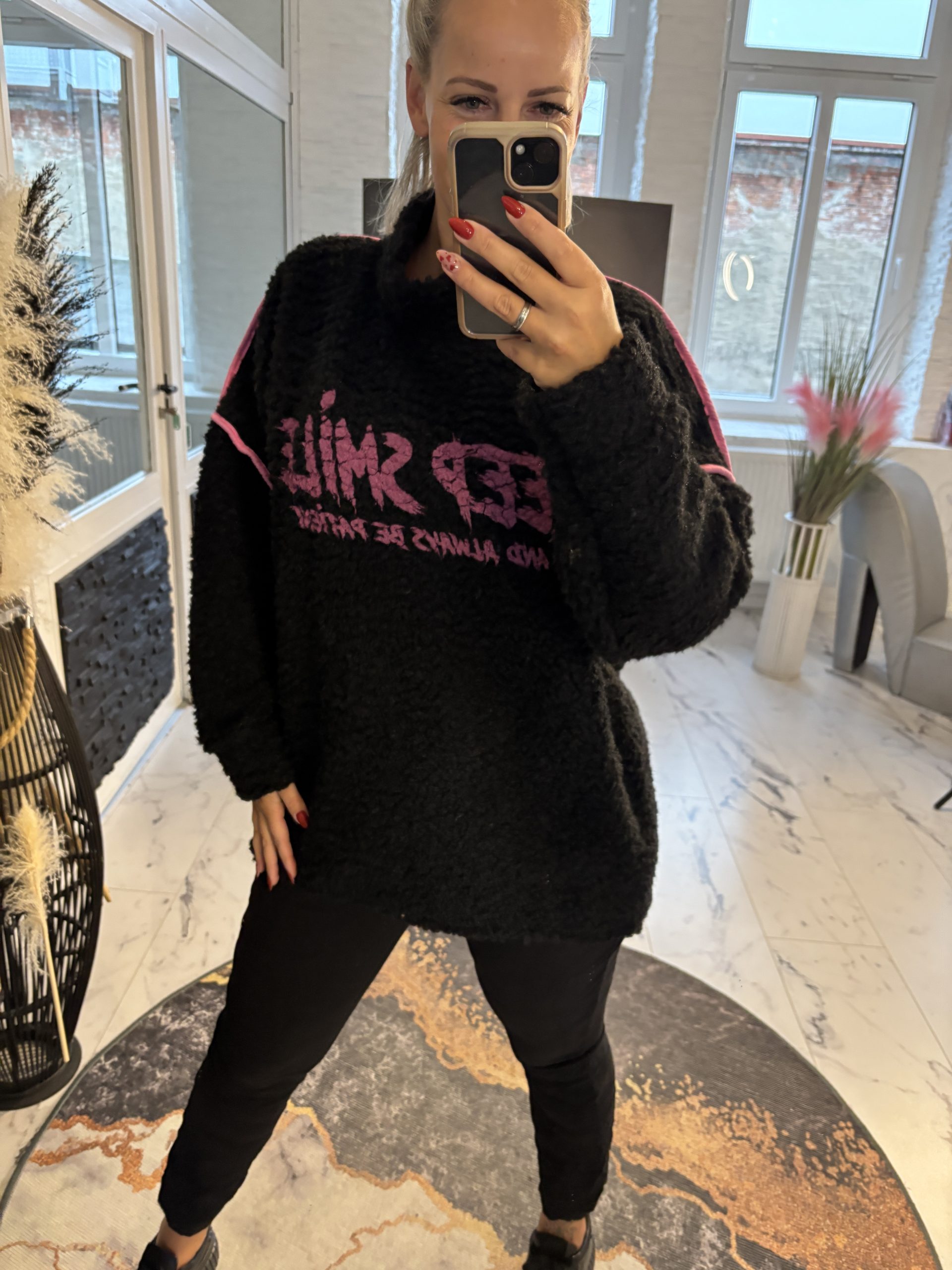 Bouclé Longpulli mit Pinker Schrift und aufgesetzten Nähten an den Armen..