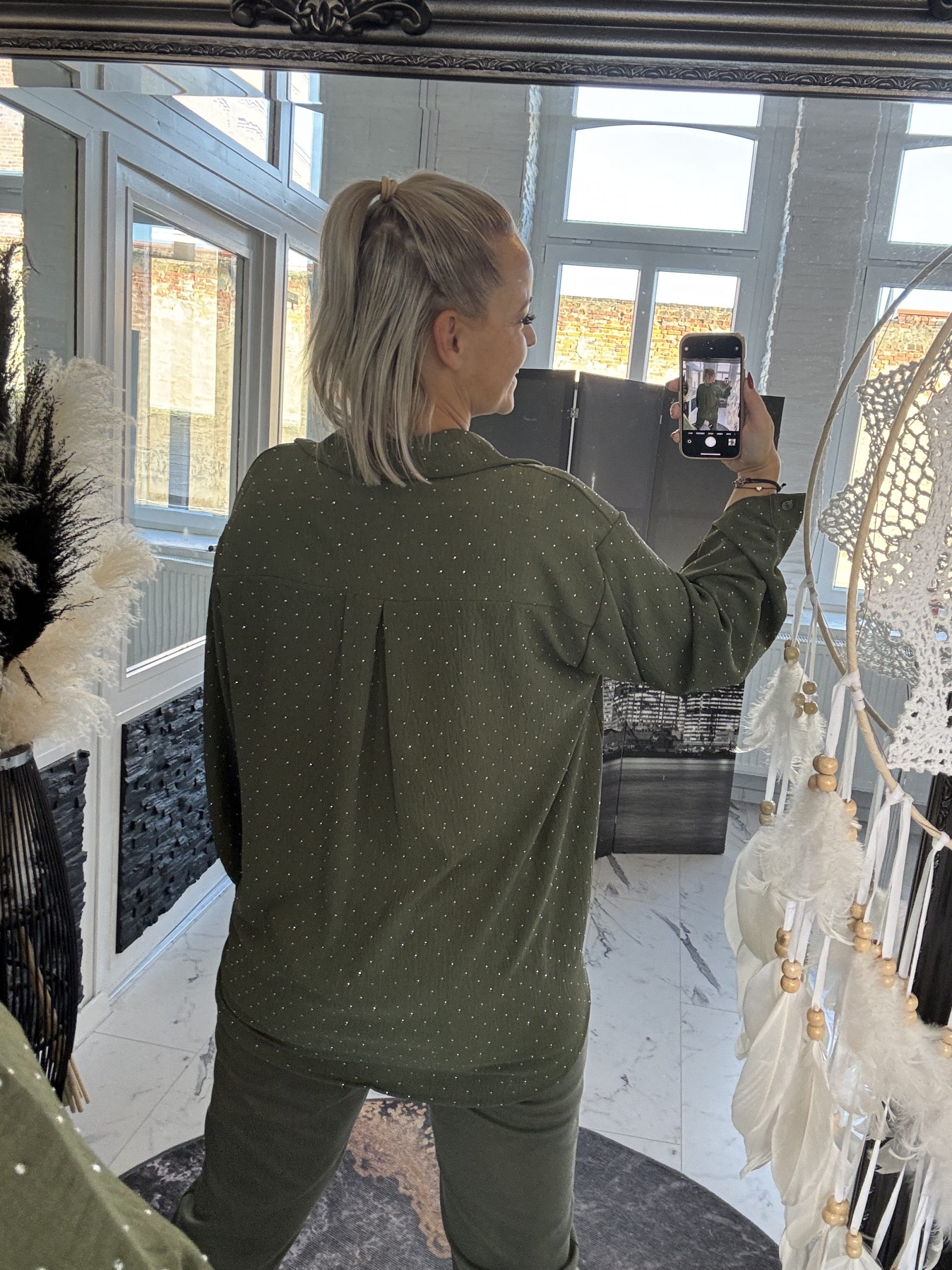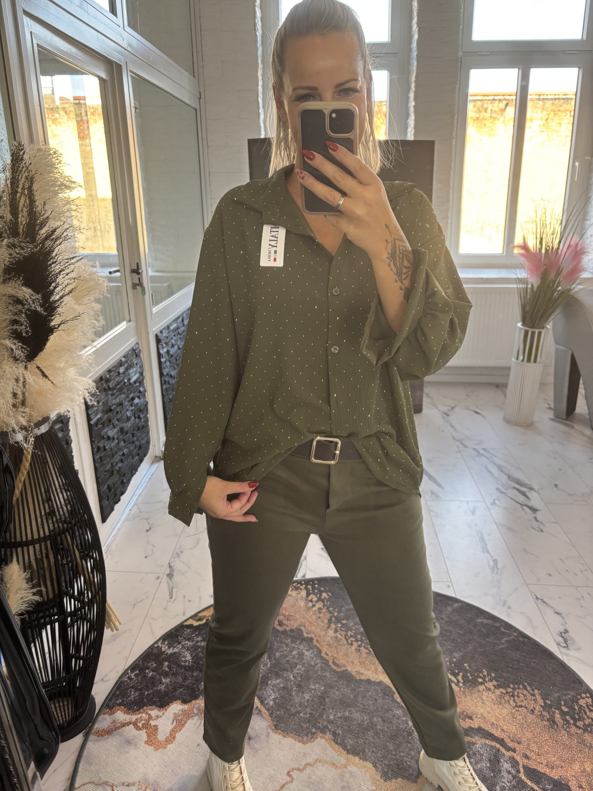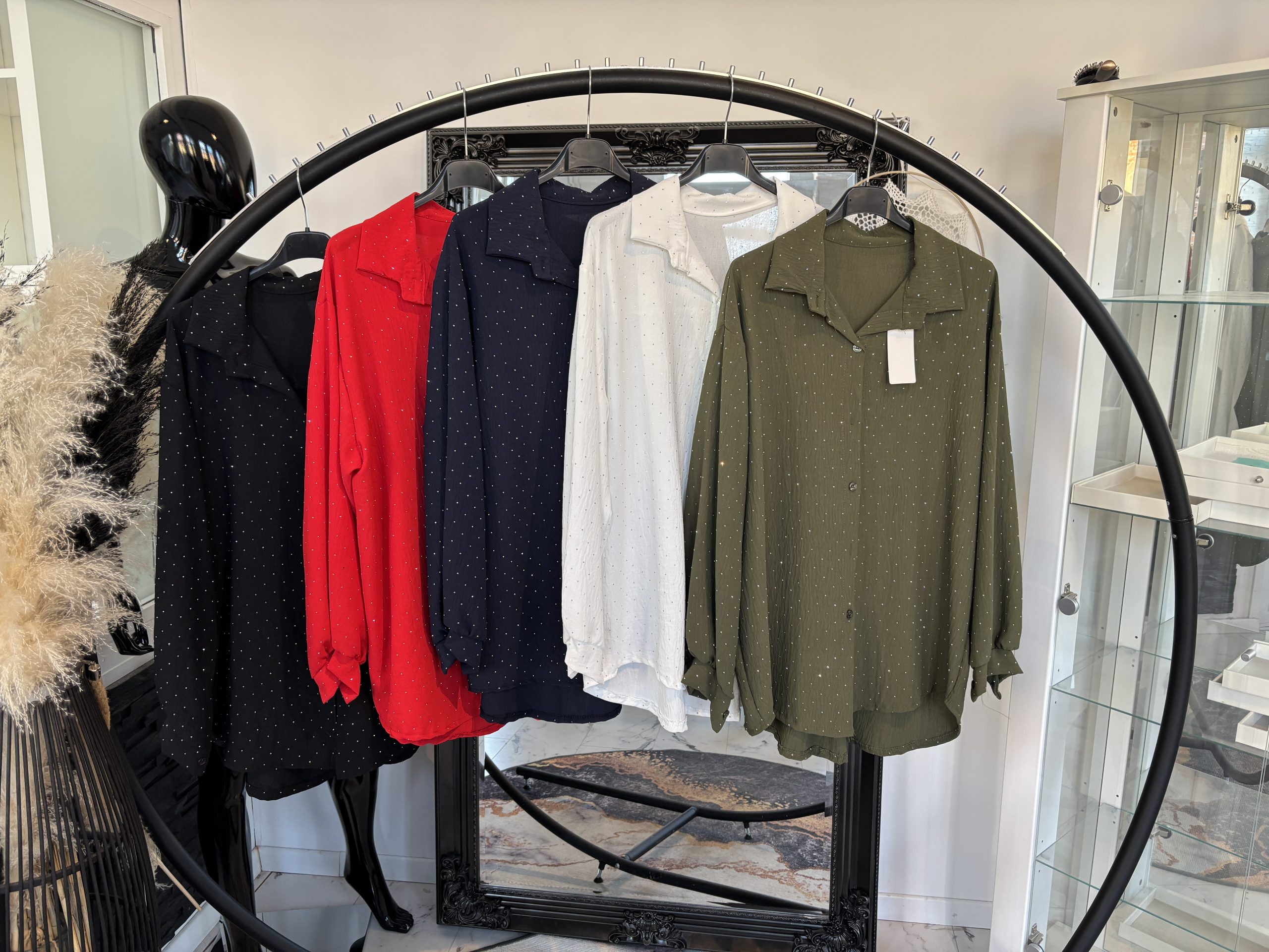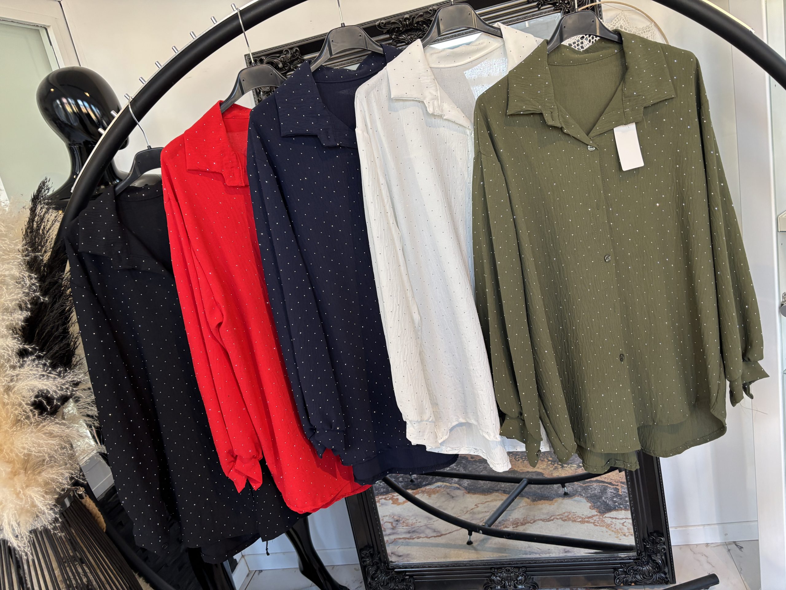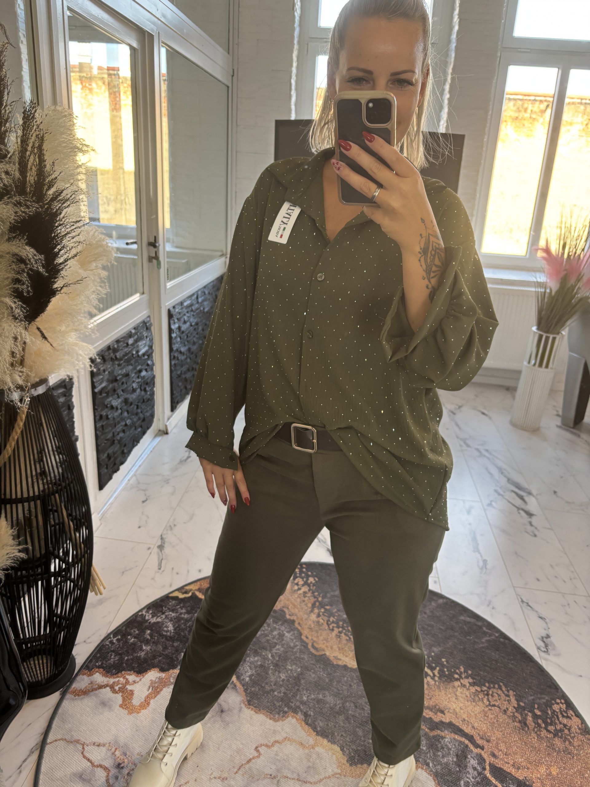 Glitzer Bluse mit Kragen und Knopfleiste.