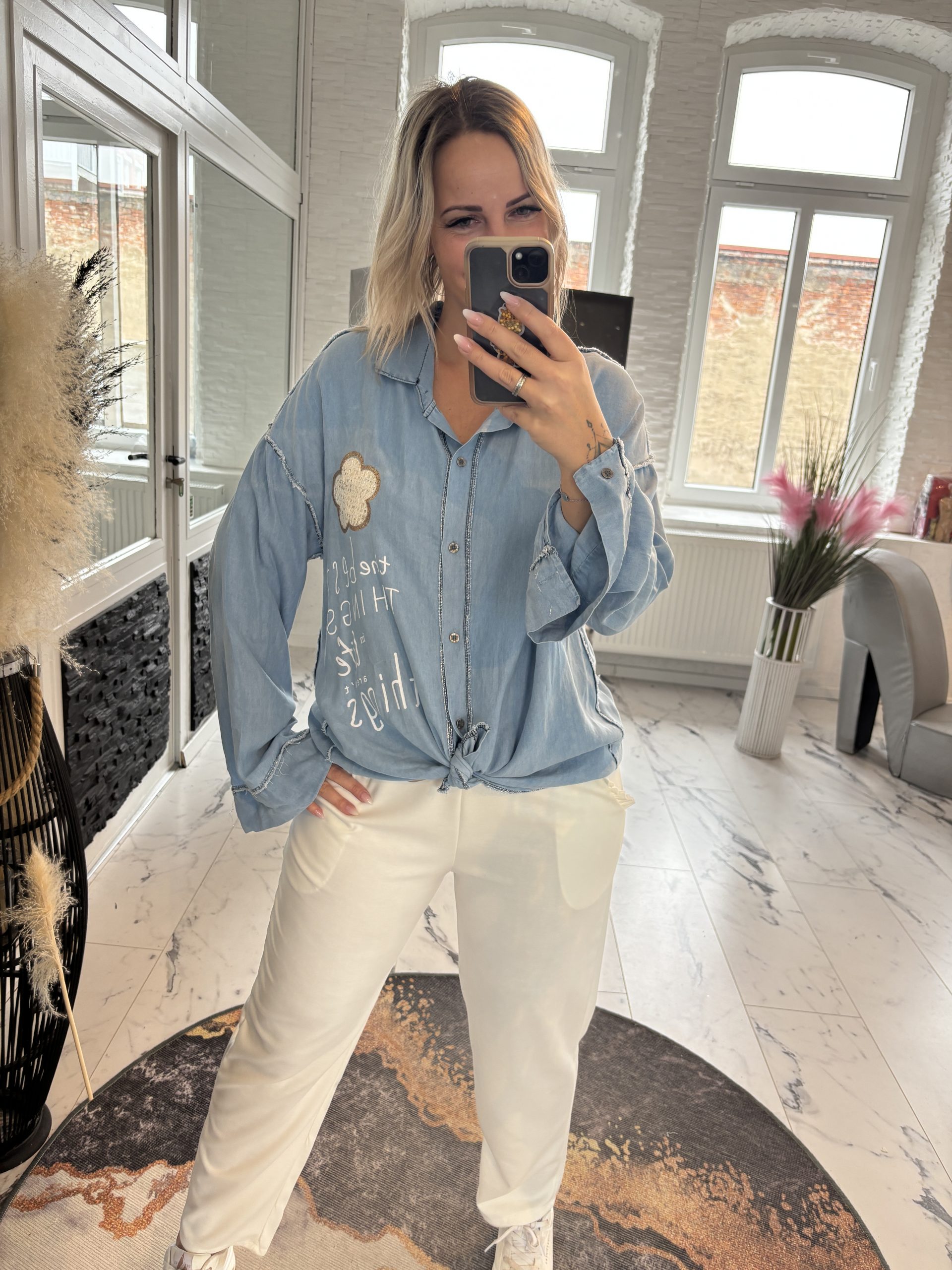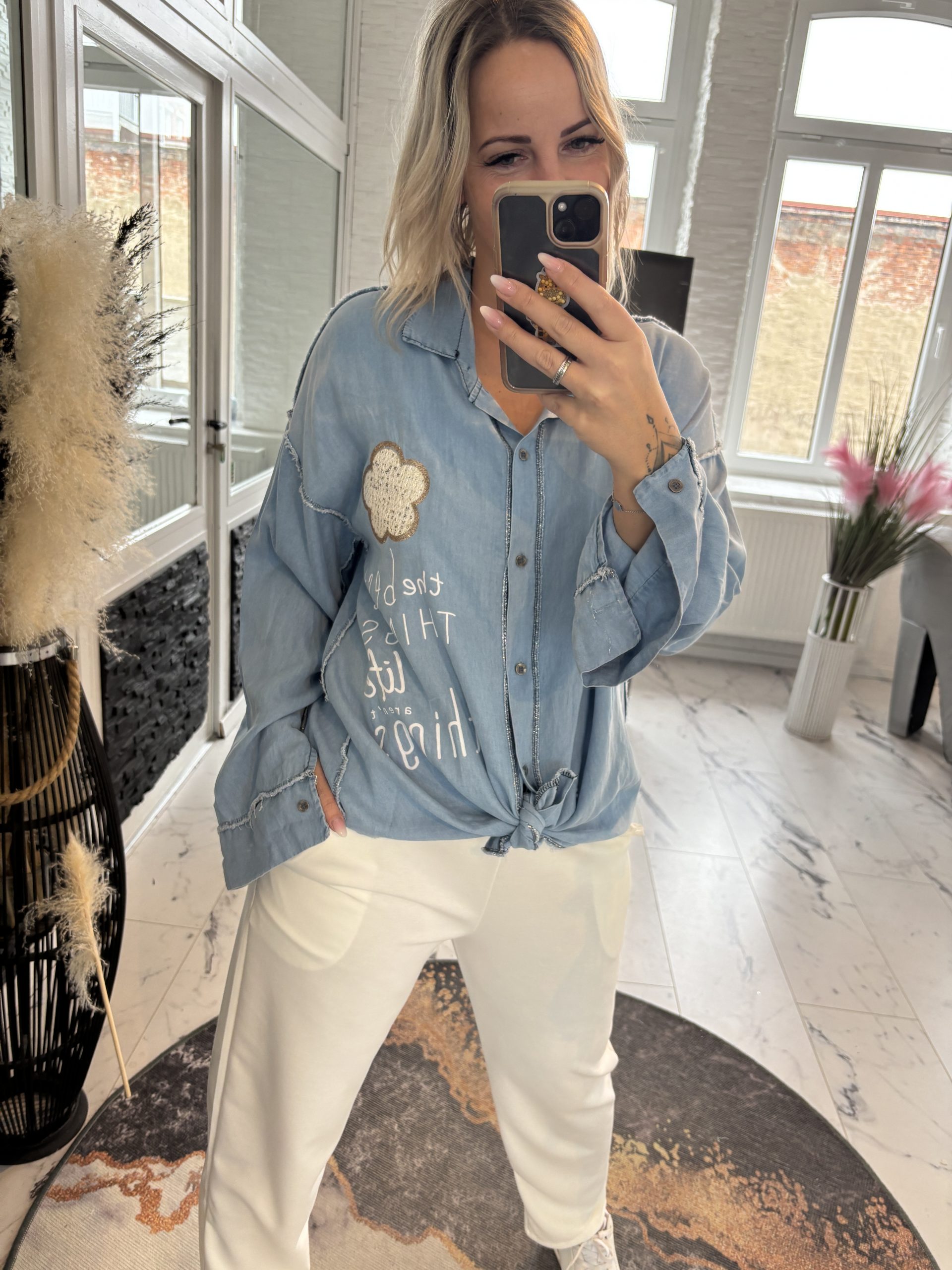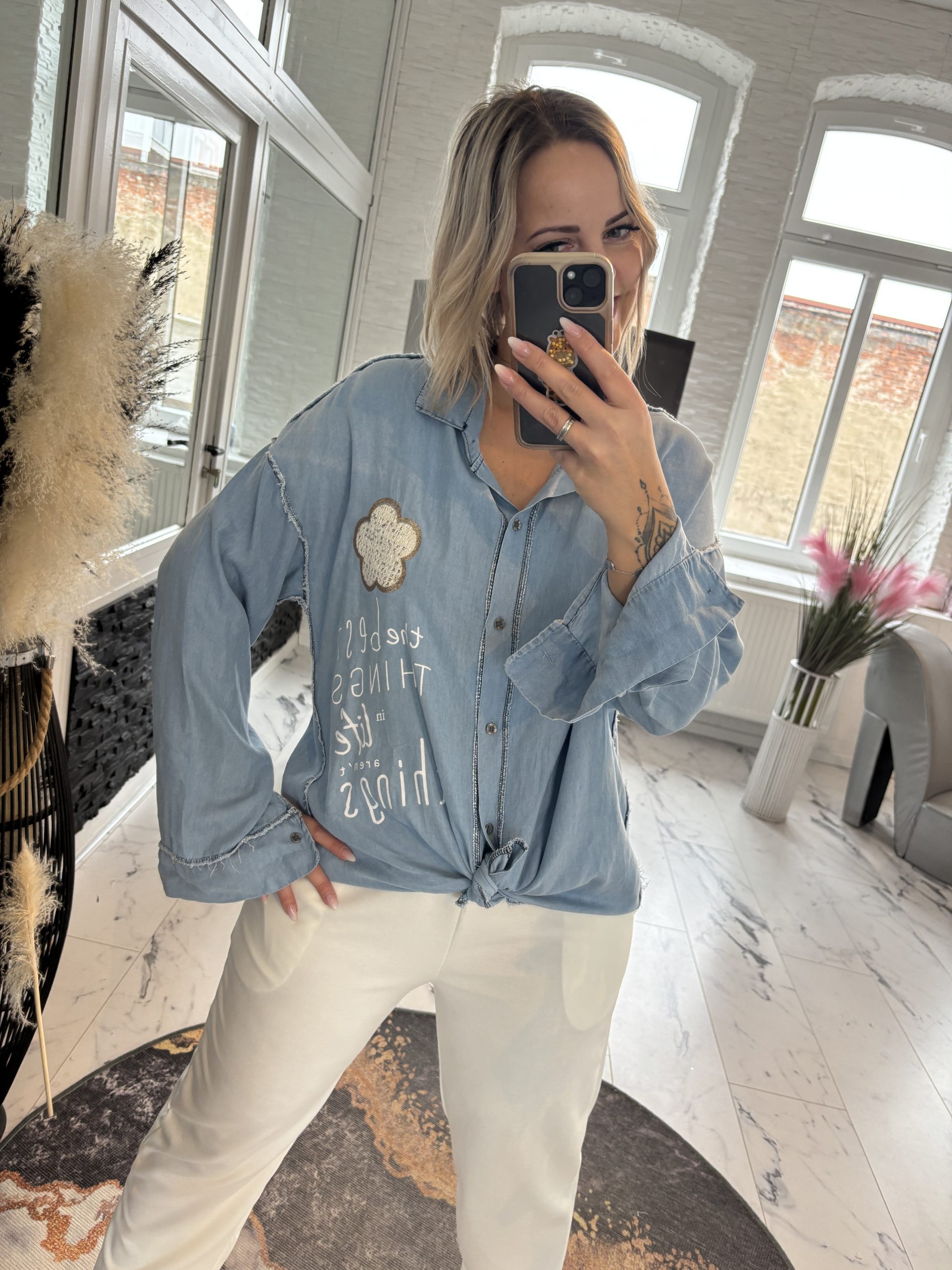 Jeansbluse durchgehend zum knöpfen mit Blumen Print